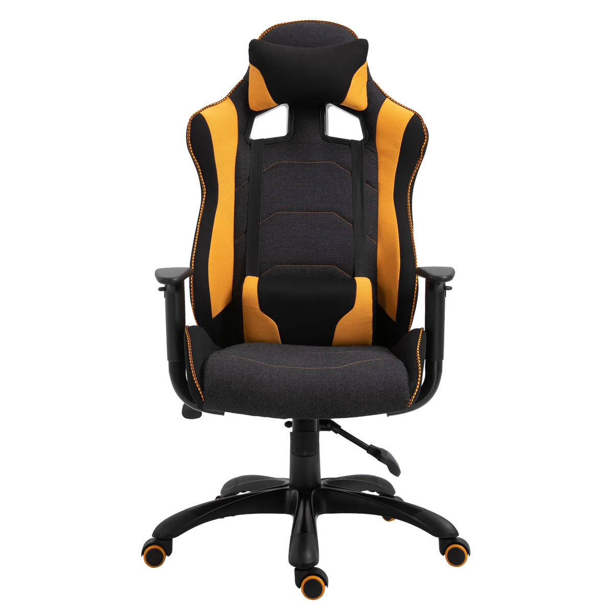 Turn the style points up a gear with this racing chair from . A large and executive design for supreme comfort as you sit, play and work, its ergonomic features include a wide seat, a tall and supportive back with cut-out panels and height adjustable armrests. Filled with foam for ensuring comfort, it is upholstered with soft material which cleans easily, with the yellow panels and stitching bringing a vibrant look. Adjustable in height, it is finished with castors wheels on the base and head and back pillows for extra support.